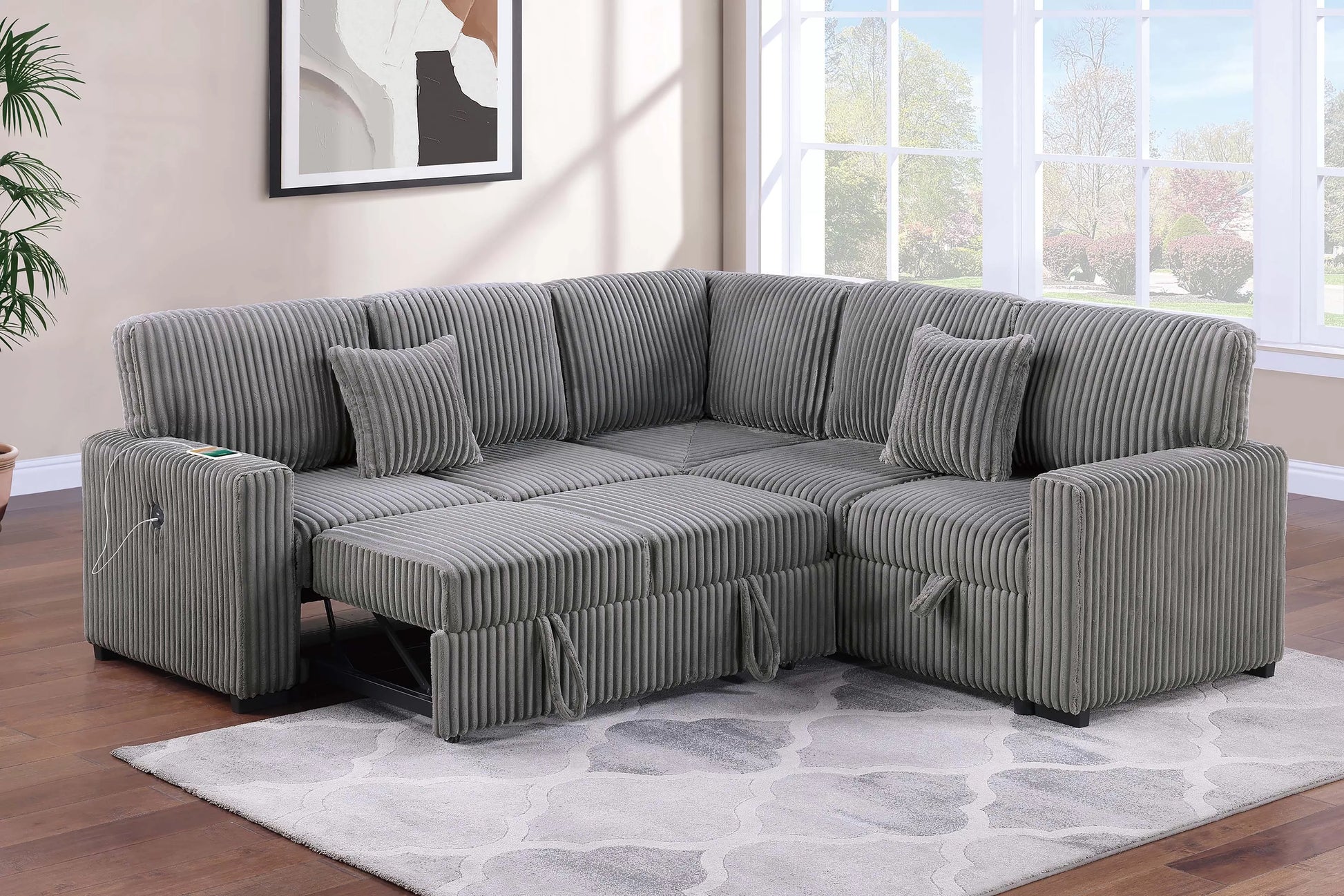 Reversible Storage Sofa + Reversible Sofa with pullout bed and USB port. Transform your living room into a space of comfort and convenience with this 3-Piece Convertible Sectional, designed to meet the needs of modern lifestyles while adding a touch of cozy sophistication. Upholstered in a fur-like corduroy fabric, the sectional brings a soft, inviting texture that makes lounging, entertaining, or simply relaxing at home feel even more enjoyable. Its versatile design allows you to configure the pieces to fit your room layout while offering practical features that make everyday use effortless. The sectional includes a Reversible Storage Sofa, a Corner Wedge, and a Reversible Pull-Out Sofa—giving you flexibility to create the perfect setup. The reversible storage sofa opens easily to reveal a hidden storage compartment, ideal for keeping extra blankets, seasonal throws, or living room essentials neatly tucked away but always within reach. The reversible pull-out sofa extends smoothly with a handle at the base, instantly transforming into a comfortable sleeping surface for overnight guests. With both sides designed to be reversible, you can adjust the chaise and pull-out placement to suit your space, whether you prefer a left-facing or right-facing configuration. Adding to its thoughtful functionality, one arm of the sofa is equipped with a built-in USB port, allowing you to conveniently charge your devices while relaxing. The set also includes two coordinating throw pillows that complete the look with an added touch of style and comfort. This sectional blends comfort, practicality, and modern design into one versatile package—perfect for families, small apartments, or anyone looking to maximize both space and style.