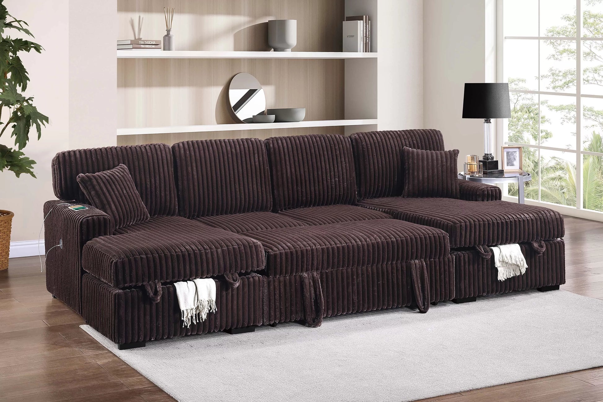 3 piece sectional with pull out sofa and 2 storage chaises with USB ports. This stylish and practical piece combines comfort, storage, and versatility in one sleek design. Upholstered in soft Fur-Like Jumbo Corduroy, the sectional offers a cozy texture that’s perfect for lounging. It comfortably seats up to four people, making it ideal for family gatherings or relaxing with friends. The sectional features two spacious storage areas, conveniently located under the seats of both the RAF (Right Arm Facing) Chaise and LAF (Left Arm Facing) Chaise, providing the perfect spot to stow away blankets, pillows, or other living room essentials. When extra sleeping space is needed, the middle section easily pulls out, transforming the sectional into a bed for overnight guests. Adding to comfort and style are two matching accent pillows that complement the overall design, while the low-profile legs provide a modern, grounded look that seamlessly fits into any room layout. Whether you're hosting or just enjoying a quiet night in, this sectional offers functionality without compromising on style.