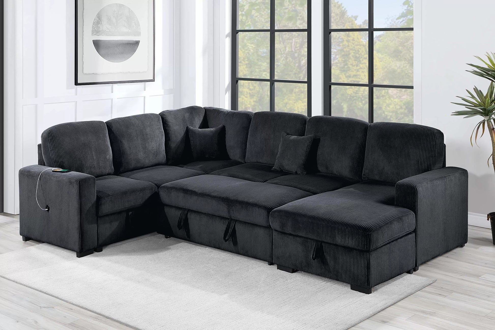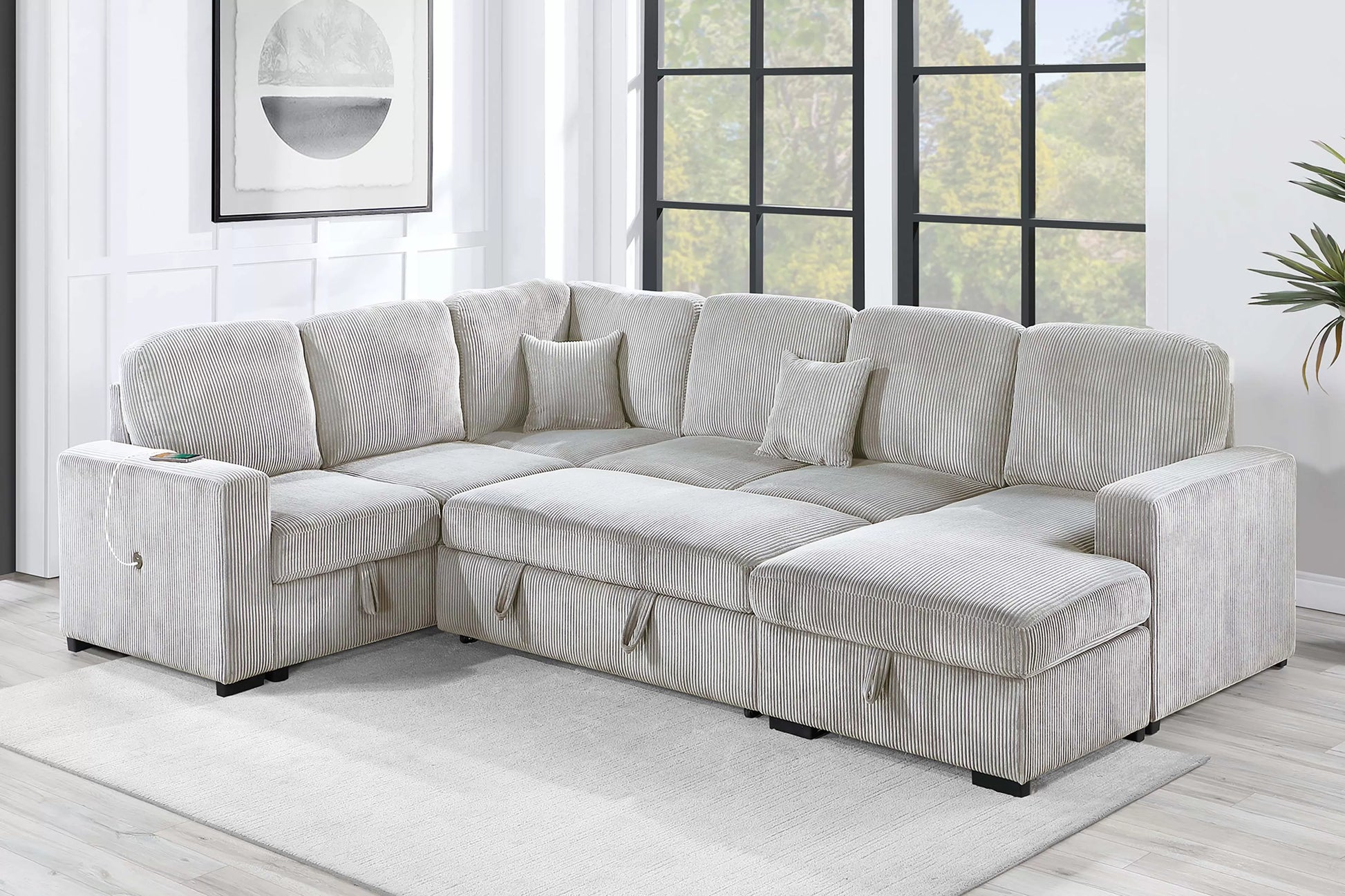 Sleeper Sofa, Chaise Storage, Sofa Storage and USB port. This sectional is the perfect addition to any home, combining convenience, modern design, and cozy comfort all in one. Crafted from wide-welt corduroy, it offers a soft, inviting texture that's both durable and stylish. This spacious sectional features two hidden storage compartments conveniently located underneath the seat of the RAF Chaise and the LAF 2-seater Sofa, offering ample space to store blankets, pillows, or other living room essentials. The center section effortlessly transforms into a cozy bed, making it ideal for overnight guests or a quick nap. With two matching accent pillows included, this sectional provides both comfort and style to elevate your living space. Stay connected with the built-in USB port on the arm area, allowing you to charge your devices without disrupting your relaxation time. Designed with low-profile legs for a sleek, modern look, this sectional comfortably seats up to five people.