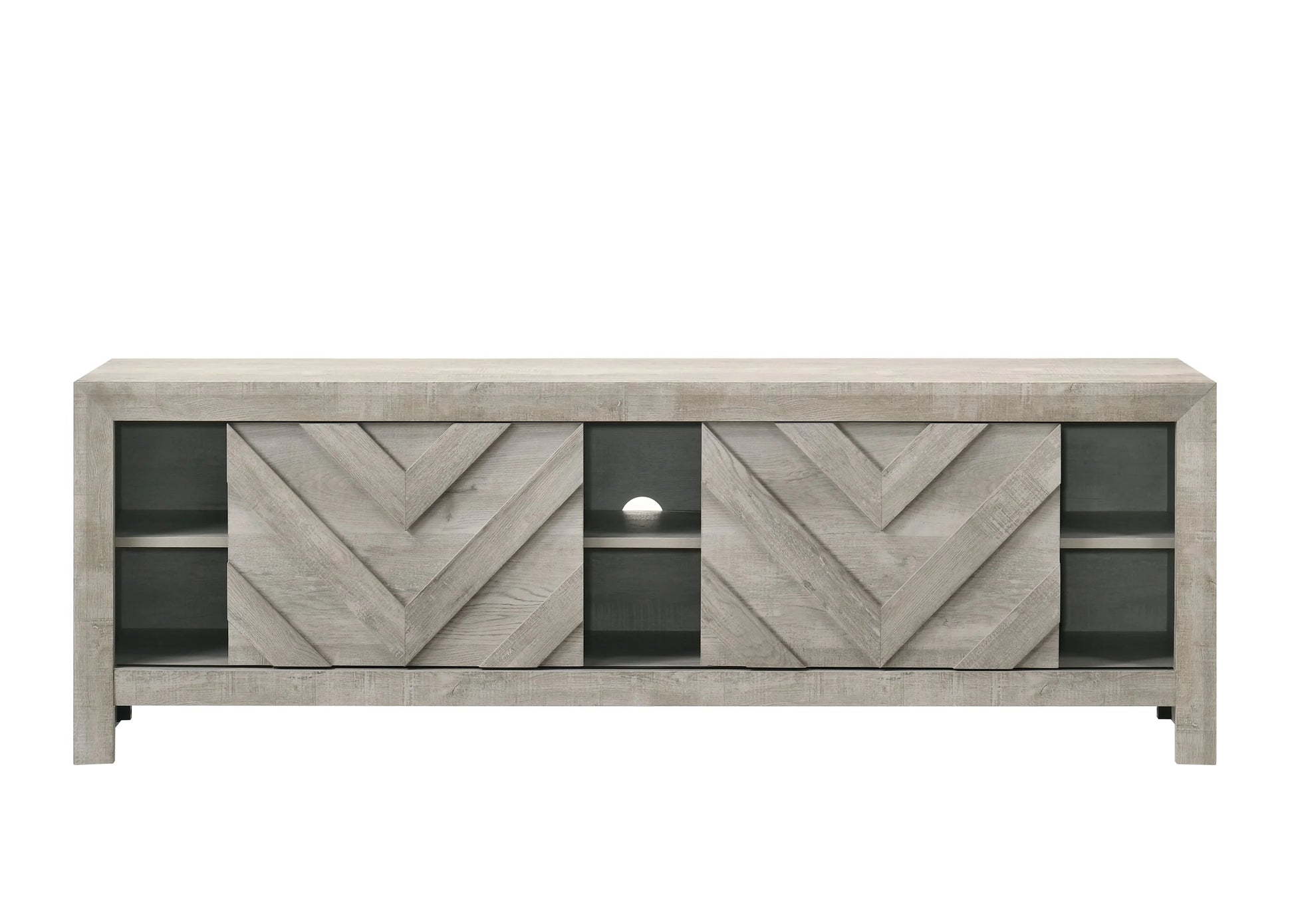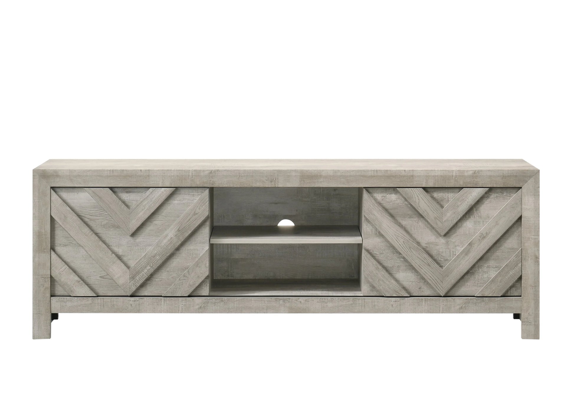 Discover the epitome of rustic elegance with this captivating entertainment console, designed to anchor your living space with its distinct and artful presence. The washed wood finish offers a serene, natural aesthetic that brings the essence of a tranquil retreat into your home. The geometric chevron patterning on the cabinet doors adds a touch of modern sophistication, making it a versatile piece that complements both contemporary and traditional interiors. Function meets form as this console provides ample space for multimedia devices, gaming consoles, and other essentials, all while maintaining a clutter-free environment.