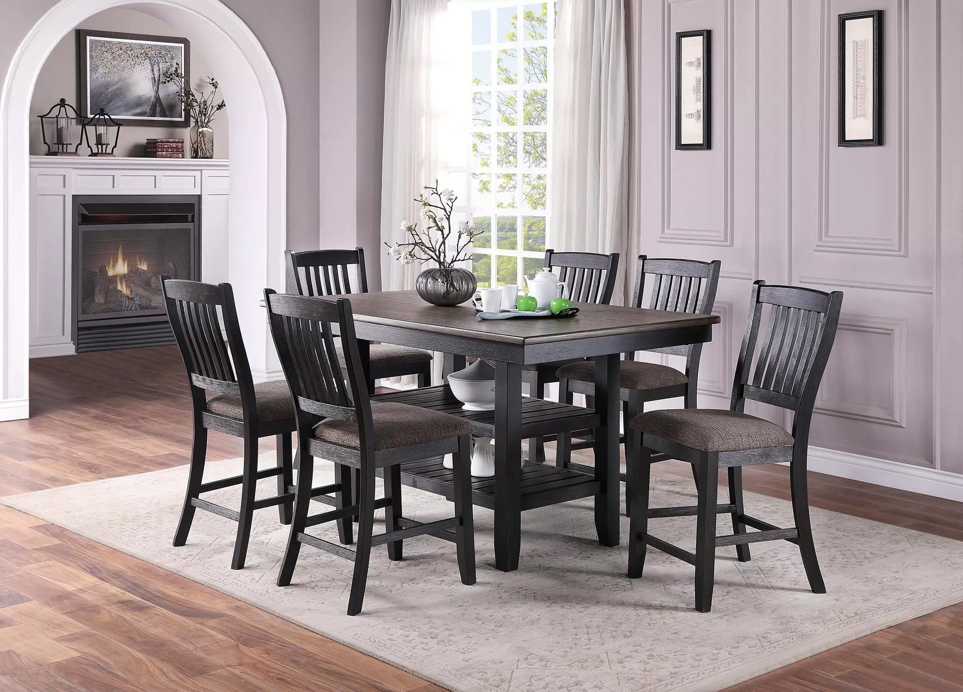 Counter Height dining set. Table + 6 side chairs. Enhance your dining experience with our 7PC Dining Set. This set features a counter height table, perfect for entertaining, and six side chairs for extended family gatherings. With its sleek design and sturdy construction, this dining set is sure to elevate any meal.